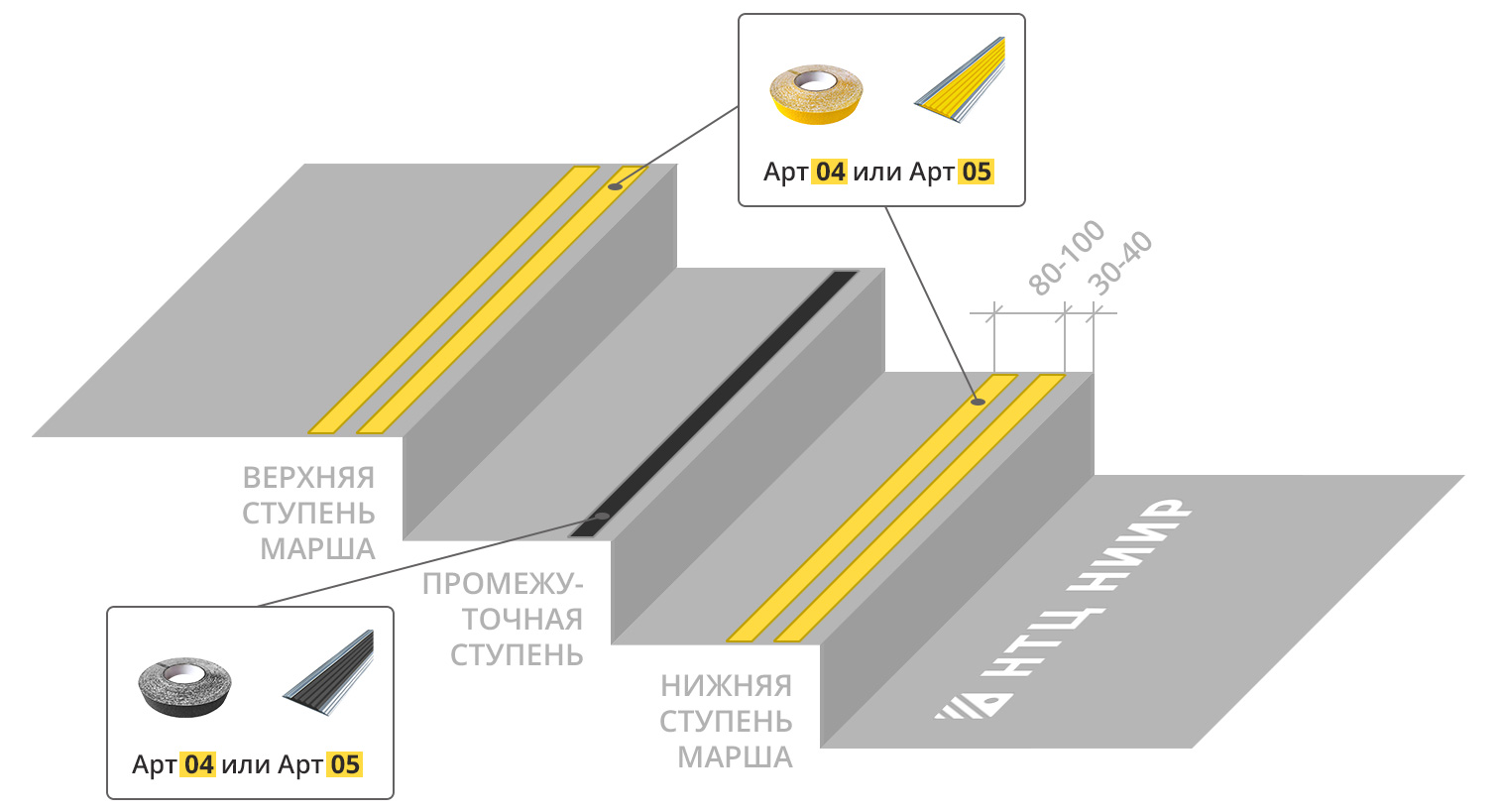 | Тактильные метки на полу | Специальные разметки или линии, выполненные из материалов с различной текстурой, которые располагаются на поверхности пола или стенах. |